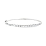 A refined showcase of craftsmanship and brilliance, this 18ct white gold diamond bangle features a sleek oval silhouette set with a continuous row of claw-set round brilliant cut diamonds across the top. Designed for both comfort and elegance, it opens on a discreet hinge and secures with a slide catch and double safety clasps. Radiant yet understated, this piece transitions effortlessly from everyday wear to formal occasions.