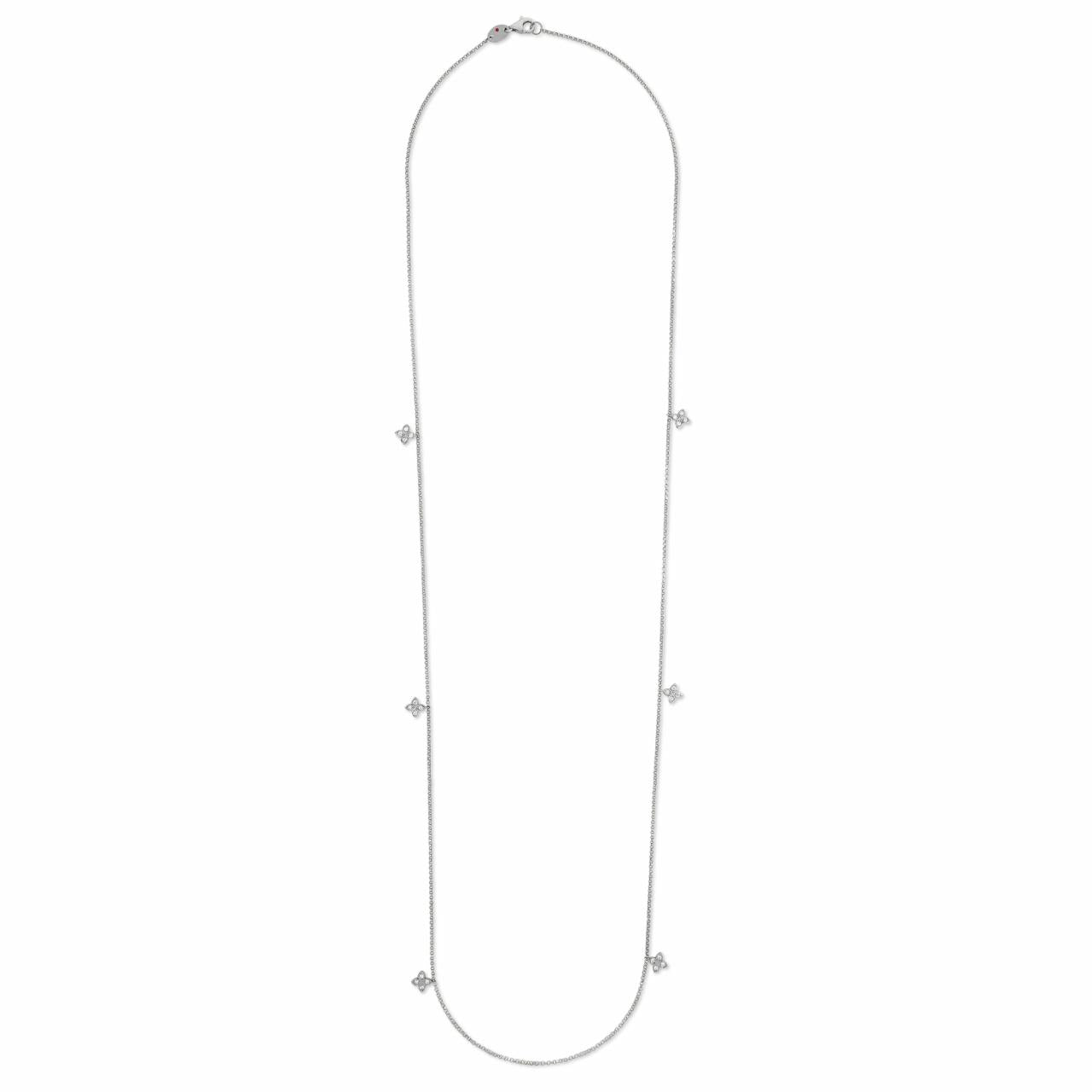 Roberto Coin Love By The Yard 18ct white gold diamond necklet featuring six flower-shaped diamond drops spaced along a fine belcher link chain with signature ruby clasp.