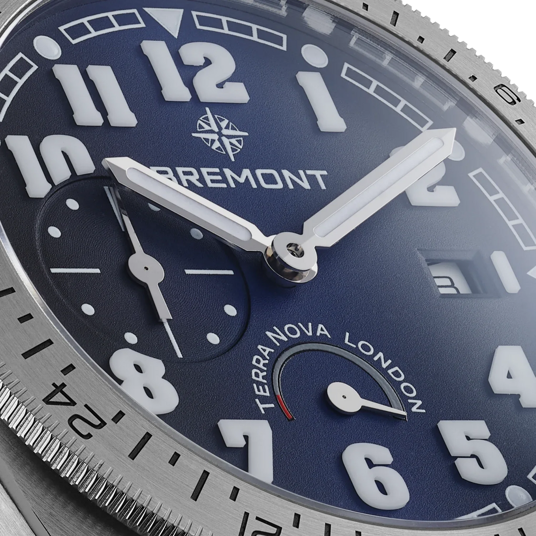 A bi-directional compass bezel is included on the 40.5mm Terra Nova Turning Bezel Power Reserve, featuring the cardinal directions, with a small seconds sub dial included as a direct reference to the heritage of vintage field watches.